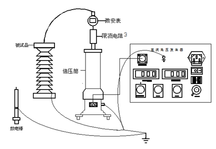 將機(jī)箱、倍壓筒放置到合適位置分別聯(lián)接好電源線、電纜線和接地線,保護(hù)接地線與工作接地線以及放電棒的接地線均應(yīng)單獨(dú)接到試品的地線上(即一點(diǎn)接地),電源開關(guān)放在關(guān)斷位置并檢查調(diào)壓電位器應(yīng)在零位。過電壓保護(hù)整定值一般為試驗(yàn)電壓的1.1倍。順時針方向平緩調(diào)節(jié)調(diào)壓電位器,輸出端即從零開始升壓,升至所需電壓后,按規(guī)定時間記錄電流表讀數(shù),并檢查控制箱及高壓輸出線有無異常現(xiàn)象及聲響。