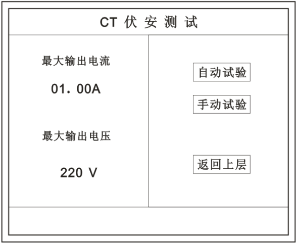 在主菜單界面,旋轉鼠標將光標移動到  CT測試  選項上,按下旋轉鼠標選擇 CT伏安  即可進入伏安特性試驗設置界面(如右圖)。光標移動至  返回上層  ,按下鼠標即可返回主菜單。