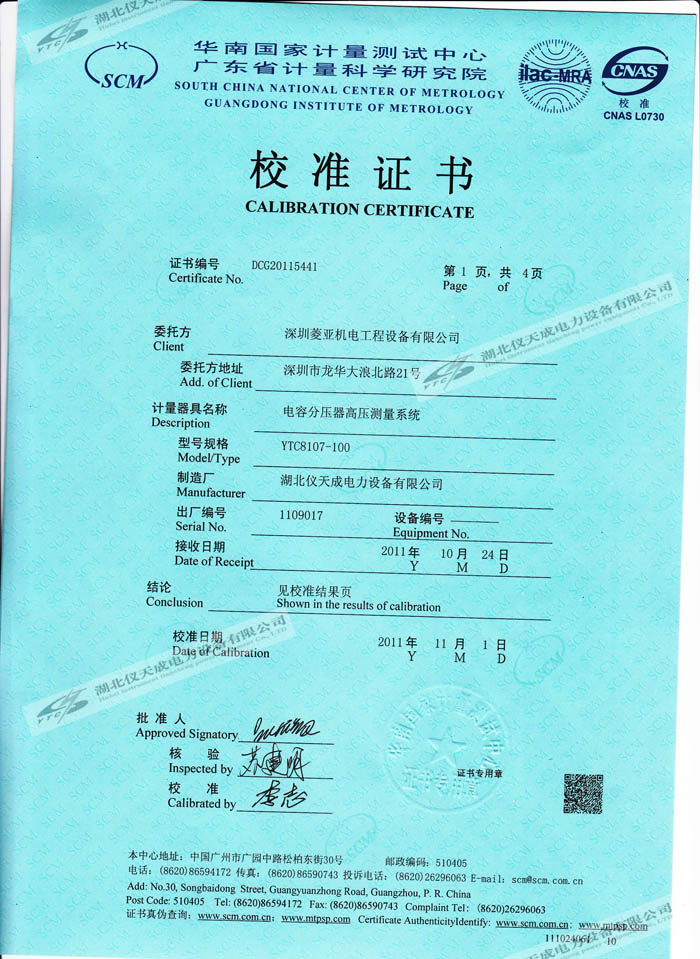 YTC8107-100電容分壓器高壓測量系統(tǒng)的資質(zhì)證書